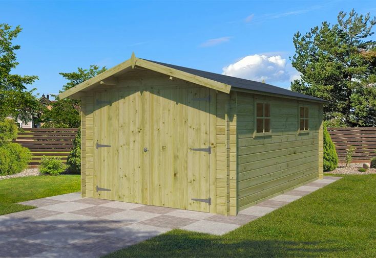 Ce garage Gardenas est composé de parois en épicéa massif de 28 mm d’épaisseur sur lesquelles repose un toit à deux pans couvert de feutre bitumeux de couleur verte. Afin d’assurer la bonne étanchéité de cette toiture, il est conseillé de poser un revêtement en shingle (disponible dans l’onglet « Accessoires », 8 paquets sont nécessaires).