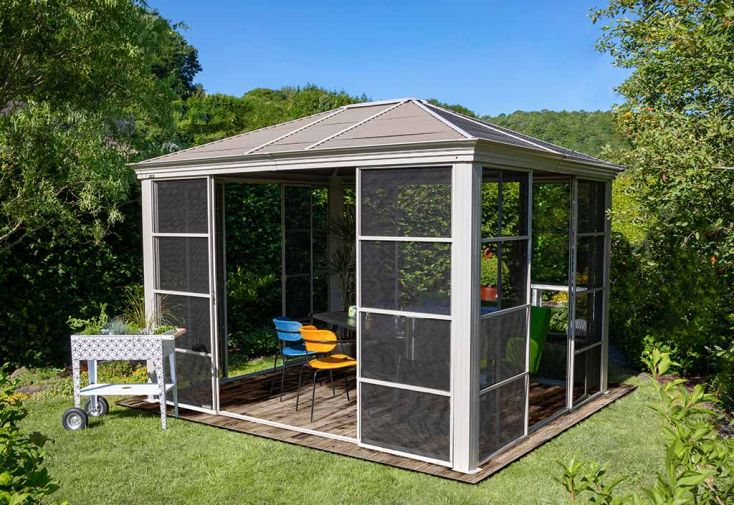 Très bien conçue, la tonnelle de jardin Striano de chez Sojag est équipée de moustiquaires renforcées en aluminium situées sur tout le pourtour de la structure. Chacun de ses quatre côtés intègre également une double porte coulissante, chaque porte étant aussi dotée d’une moustiquaire. Vous pourrez donc profiter pleinement de votre extérieur, et notamment les soirs d’été, sans être gêné par les moustiques et autres insectes nuisibles.
