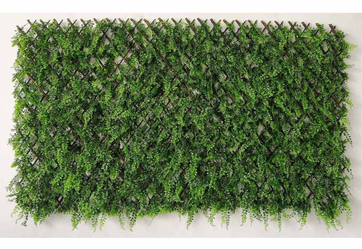 Ce treillis extensible artificiel mobilise un feuillage synthétique imitation fougères idéal pour décorer votre extérieur ou pour supprimer un vis-à-vis gênant. Ce feuillage est monté sur un treillage en bois et le tout pourra être adapté en hauteur et en longueur (taille intermédiaire : 2 m de long pour 1 m de haut).
