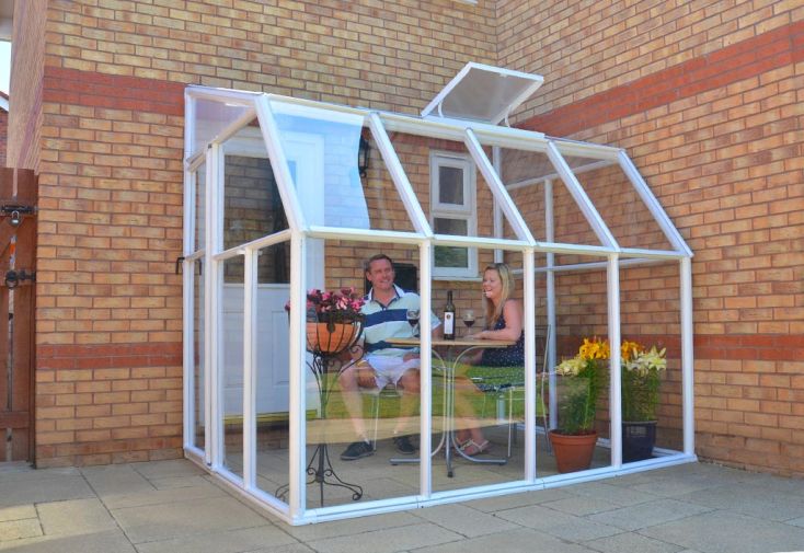 Cette véranda en PVC comprend une porte battant de 58 x 185,5 cm que vous pouvez placer sur le côté de votre choix. Cette porte montée sur charnières est équipée d’une poignée de porte verrouillable (serrure non incluse) pour en sécuriser l’accès, si vous le souhaitez. Une lucarne de toit est également incluse. Installée sur la toiture, elle facilite la circulation de l’air pour réguler la chaleur et le taux d’humidité sous la structure.